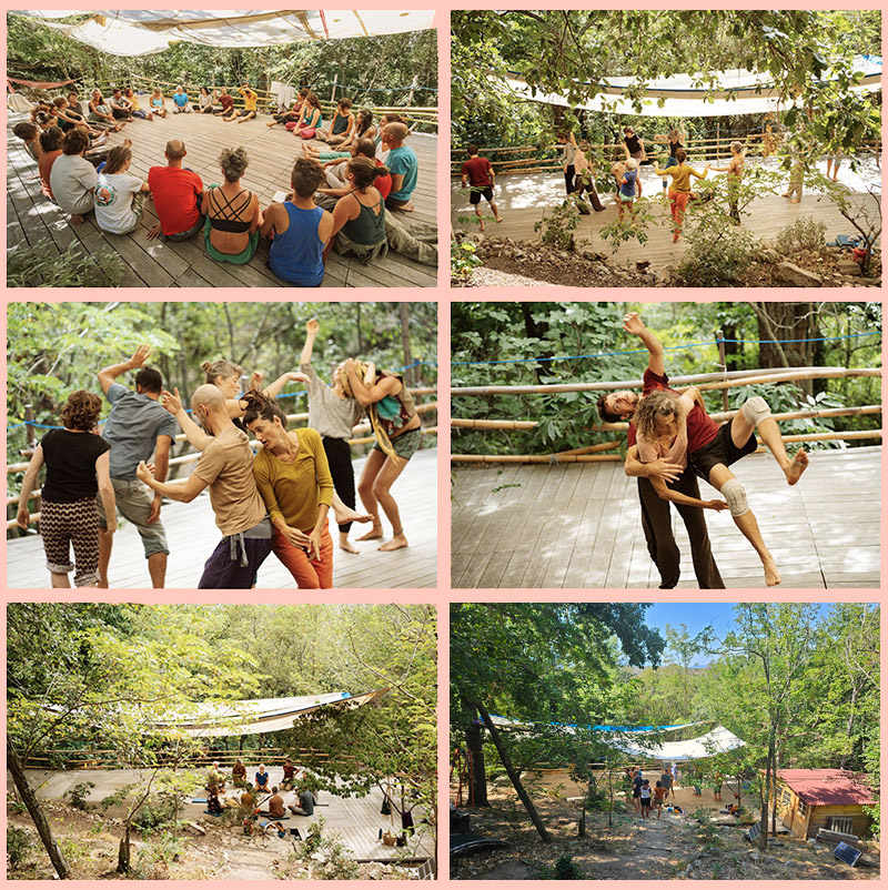 This stay will take place on a large field in energy autonomy. A floating wooden floor of 100 m2 designed for the practice of Contact Impro, will welcome you to dance barefoot under the trees.